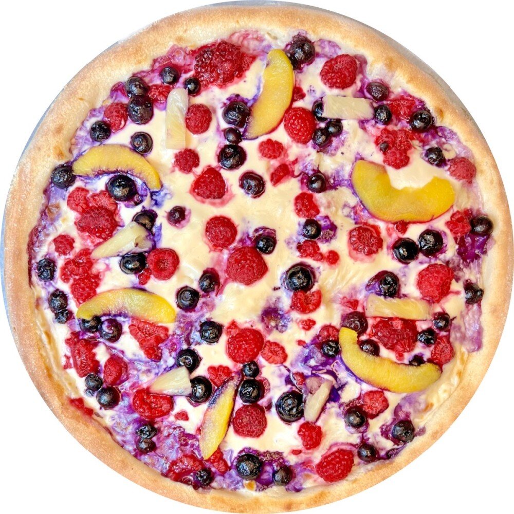 Соус сливочно-карамельный, малина, черника, консервированный персик, ананас все это на фирменном тесте.