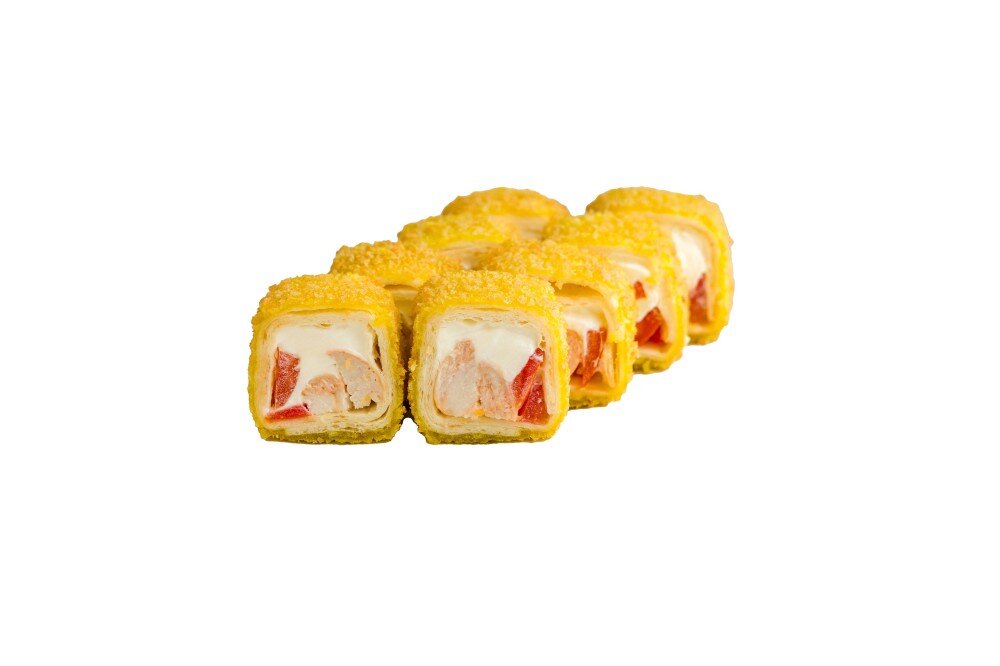 Тортилья пшеничная, сливочный сыр, куриное филе, томаты свежие, кляр, сухари панко. Соевый соус, васаби, имбирь и палочки приобретаются дополнительно.