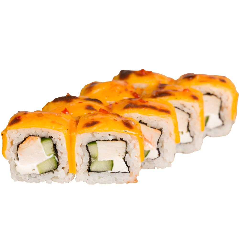 Водоросли нори, рис, огурец, сыр чеддер, филе куриное, соус чили сладкий. Соевый соус, васаби, имбирь и палочки приобретаются дополнительно.