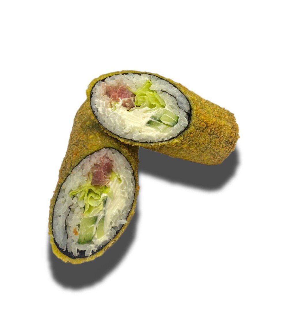 Водоросли нори, рис, тунец, сыр сливочный, айсберг, огурчик свежий, кляр. Готовится во фритюре.
