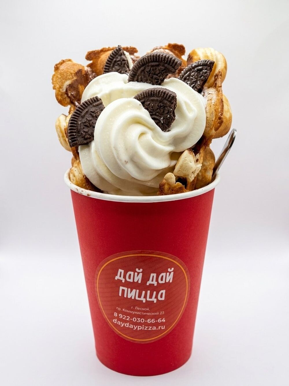 Хрустящая свежеприготовленная гонкогская вафля со ливочным пломбиром и вафельной трубочкой.