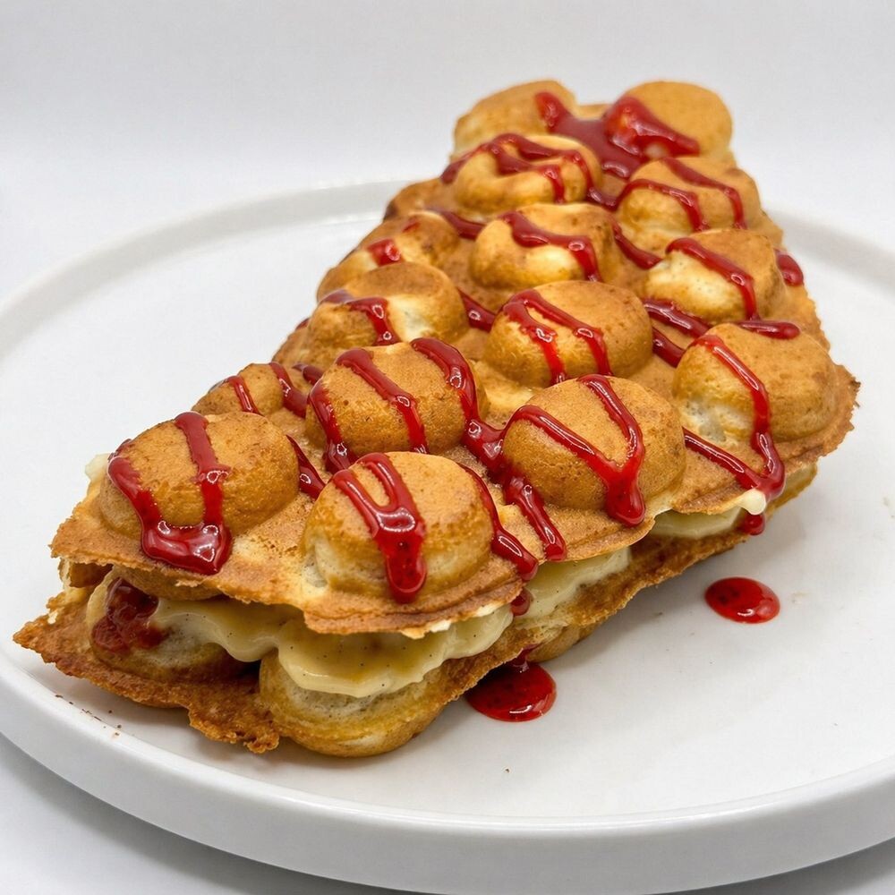 Хрустящая свежеприготовленная гонкогская вафля с сырно-сливочным клубничным кремом и клубничным топпингом.